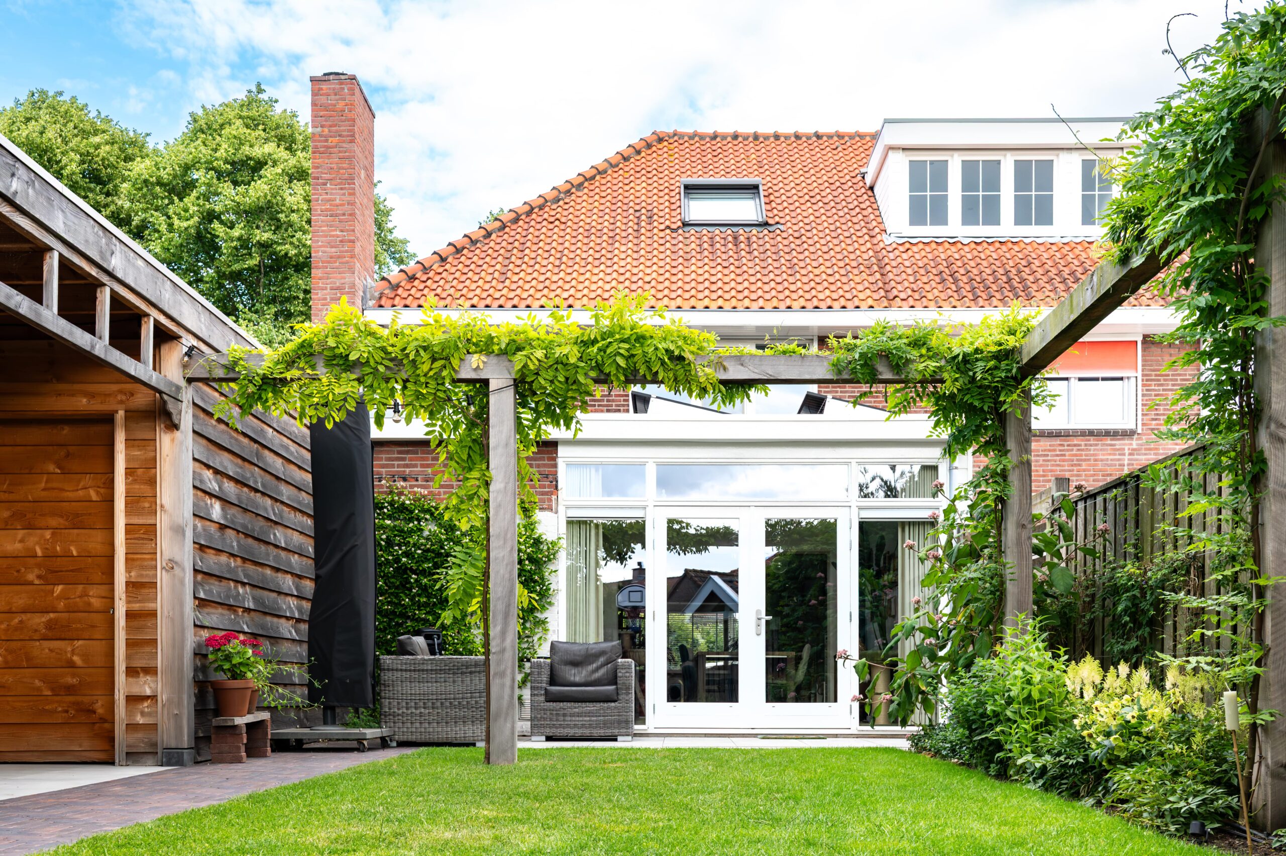 Onder de pergola – precies in het verlengde van de woonkamer – is plek voor een schommel, met uitzicht op het groene grasveld en het zonnige terras achterin. Daar, tussen de houtopslag en een fijne zitplek, is het heerlijk toeven. De trampoline achterin maakt het speelplezier compleet.