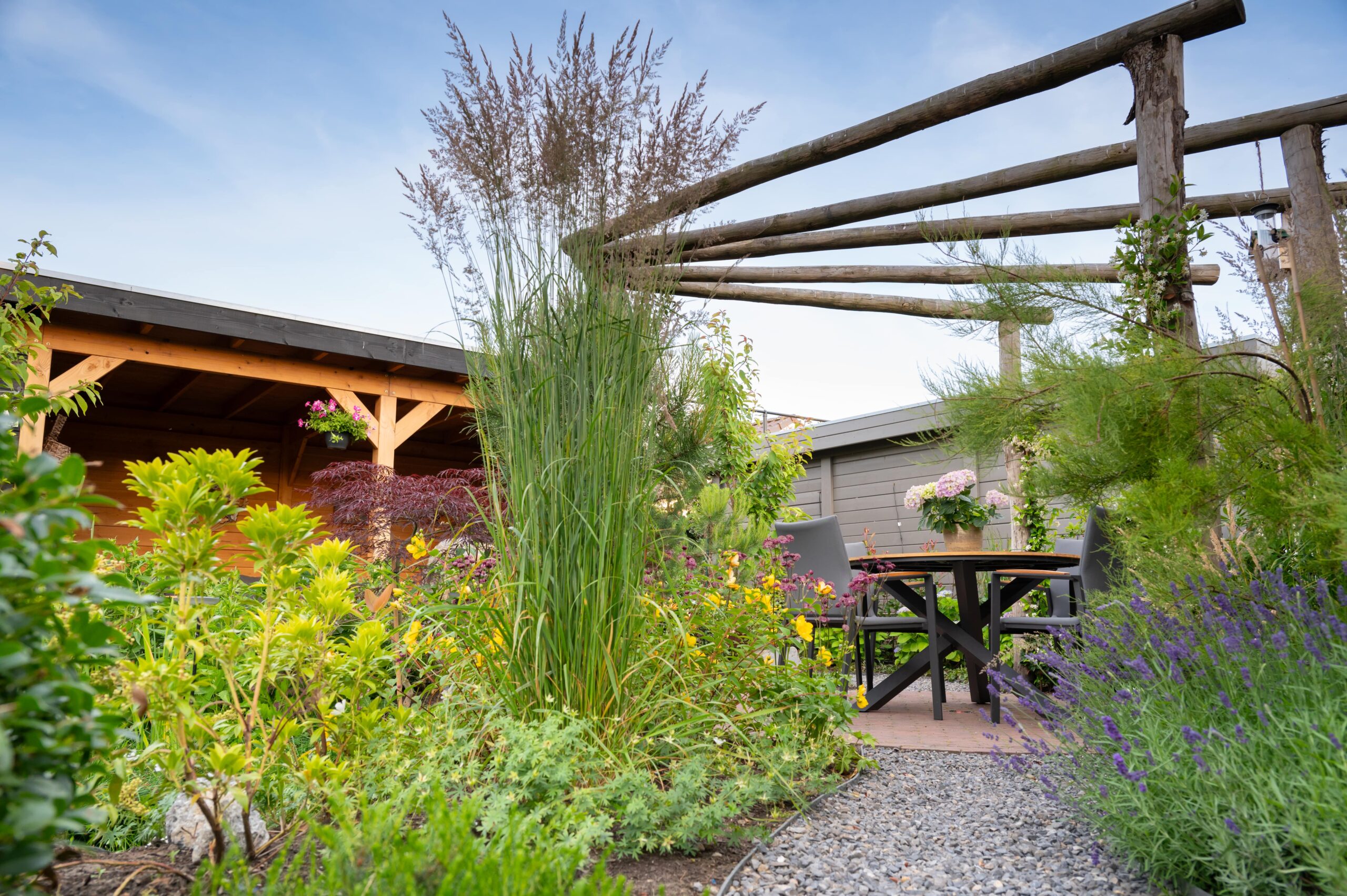 We werkten met organische vormen en natuurlijke materialen. Kastanjehouten pergola’s met Toscaanse jasmijn en clematis brengen hoogte en sfeer, terwijl de samen gebouwde veranda met berging achterin de tuin het plaatje compleet maakt.