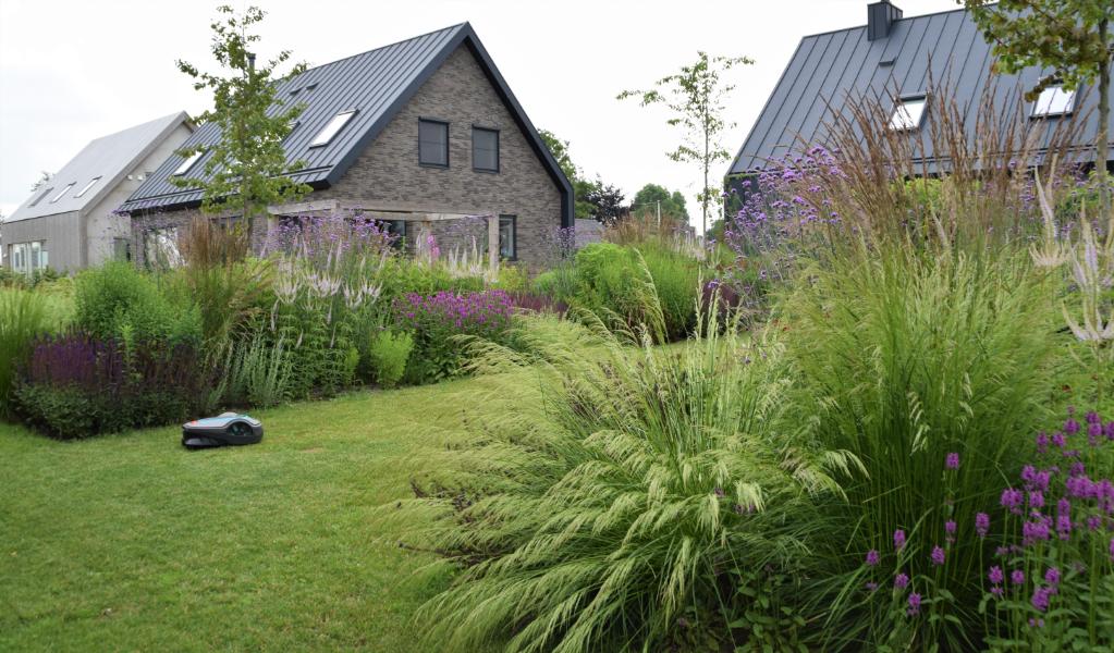 De tuin is voorzien van alle gemakken, zoals een robotmaaier en een automatisch beregeningssysteem.