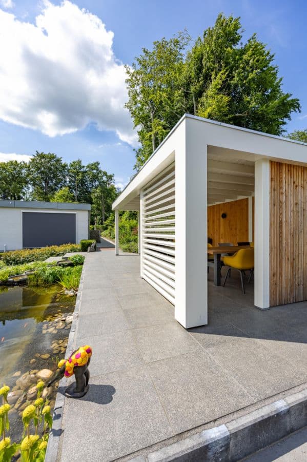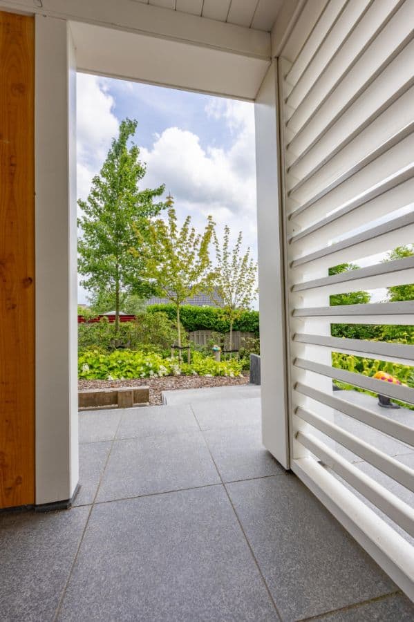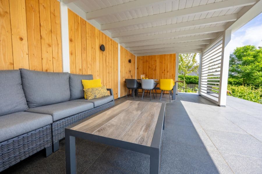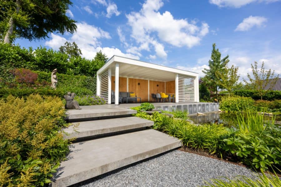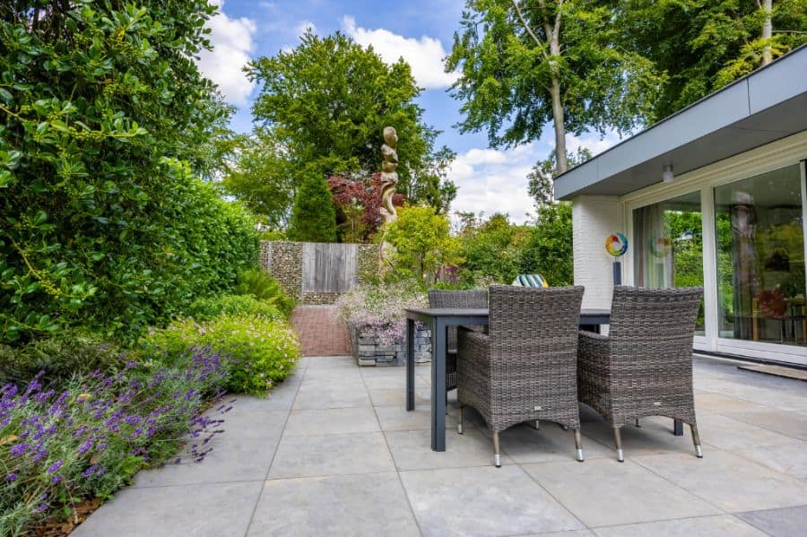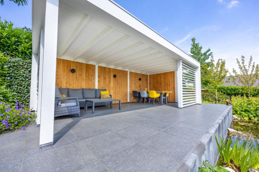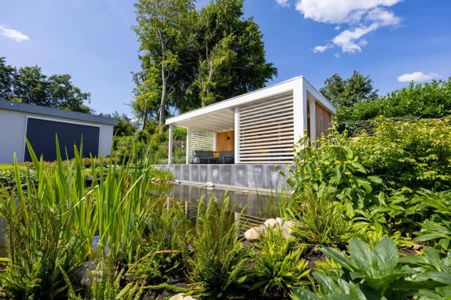 De tuin is niet alleen de moeite waard om naar te kijken, maar ook om lekker in te ontspannen. Daar is vooral het verhoogde terras met modern Trendhout buitenverblijf een geschikte plaats voor.