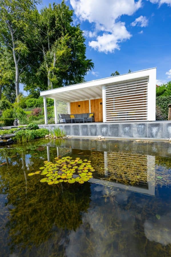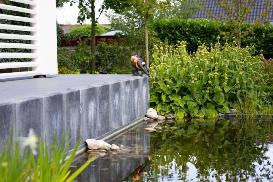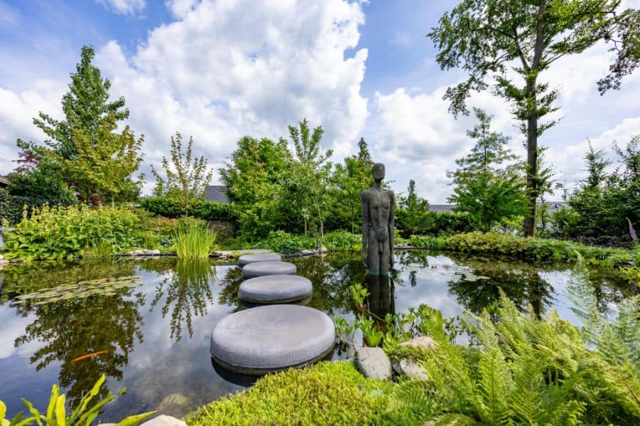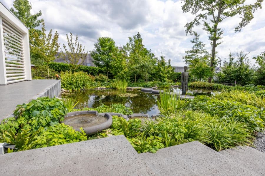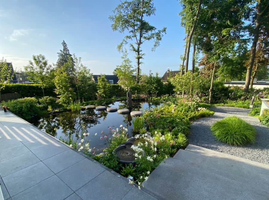 De vijver is aangekleed met keien, oeverplanten, zuurstofplanten en waterlelies.