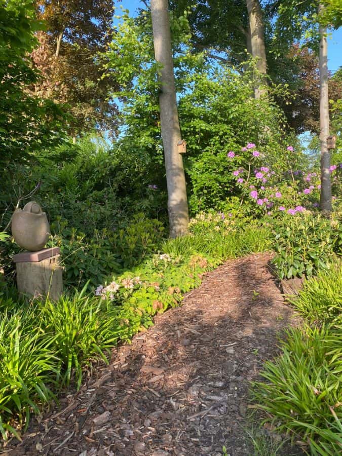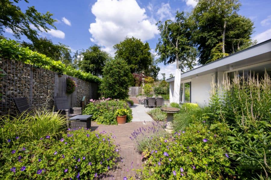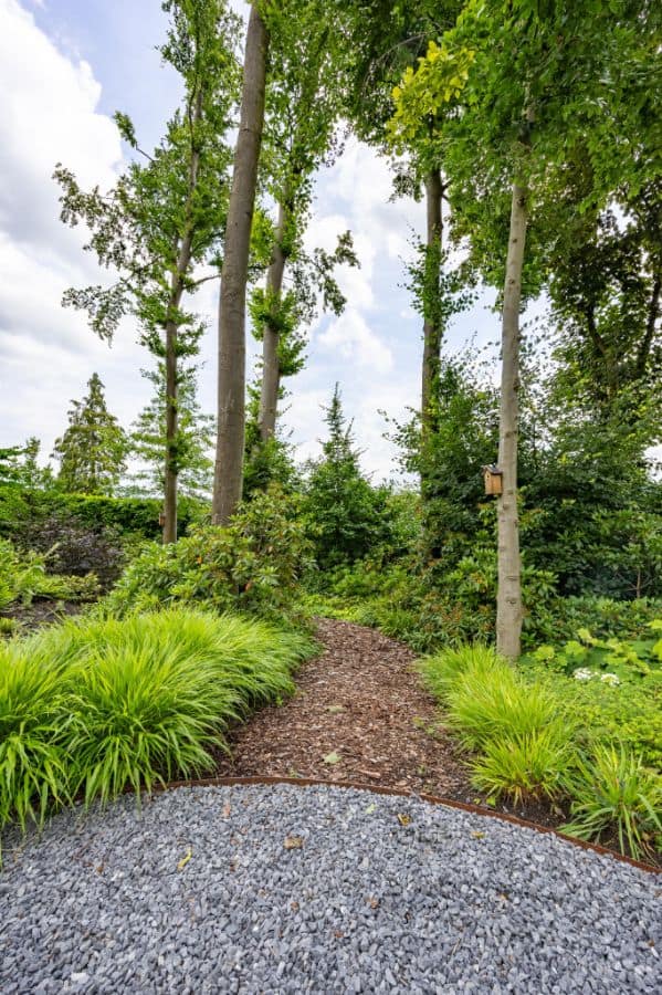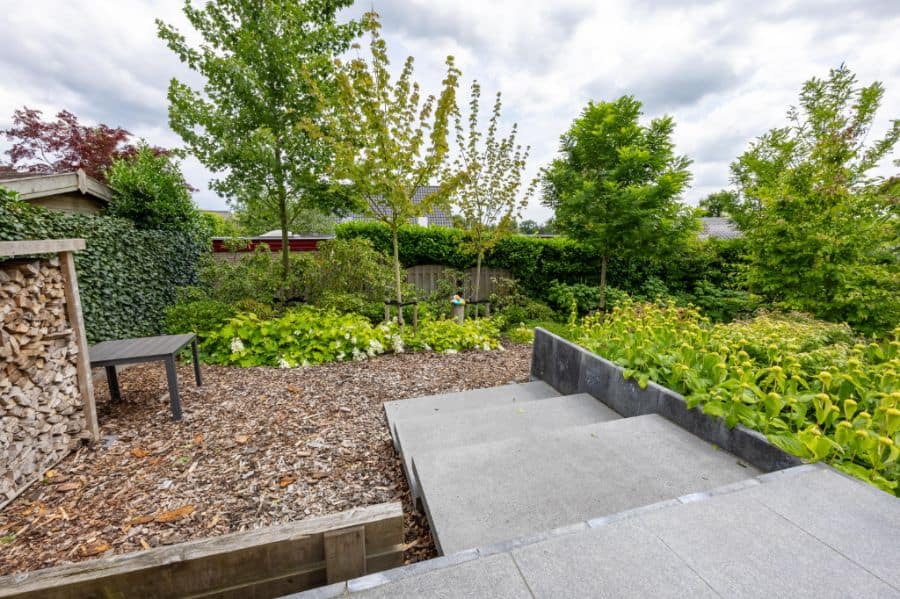Deze tuin ligt in een bosrijk gebied in Leersum. Door te kiezen voor de juiste bomen, hagen, heesters en beplanting ontstaat er ook in de tuin een bosrijke sfeer.