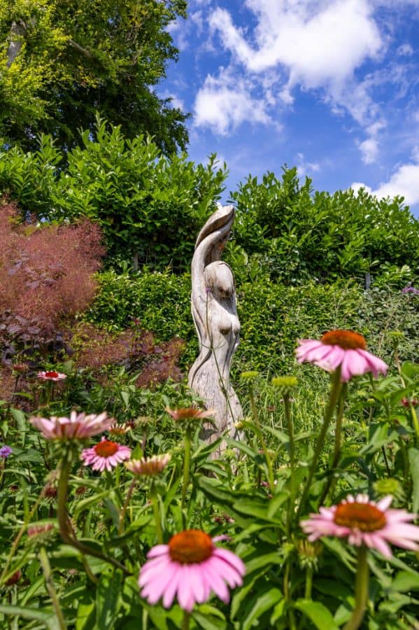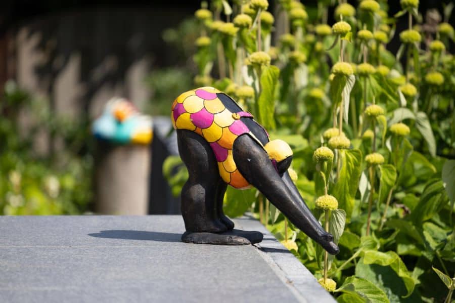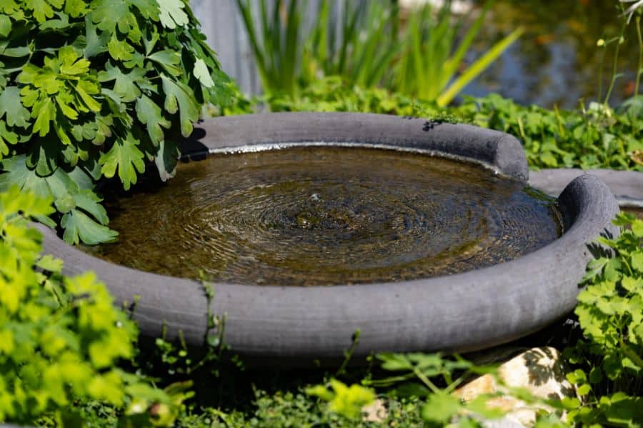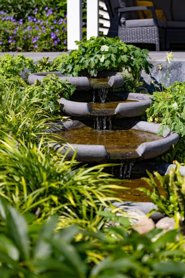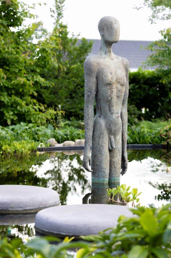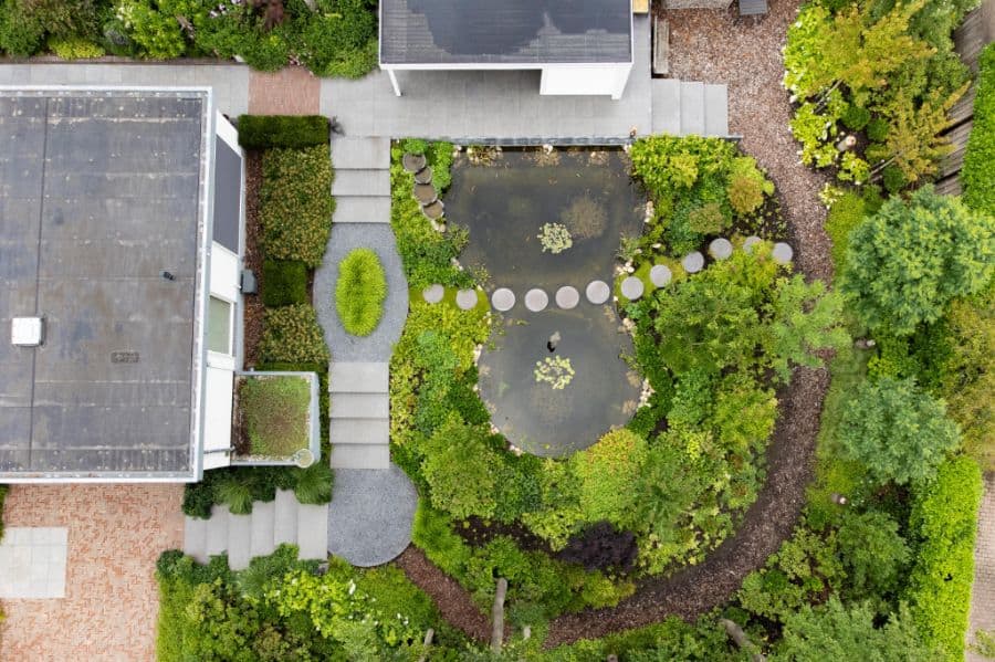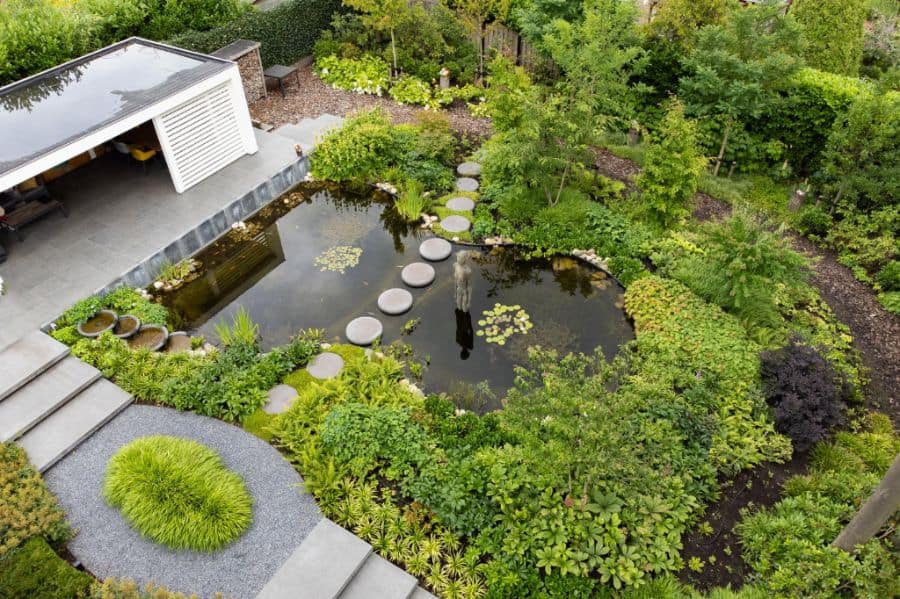 Centraal in de tuin, en echte blikvangers, zijn de vijver met stapstenen, de vlonder en de waterschalen. Het water leeft, maakt geluid, beweegt, weerspiegelt en trekt vogels, reptielen en insecten.