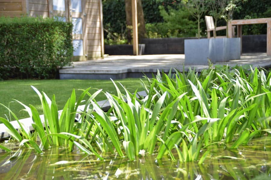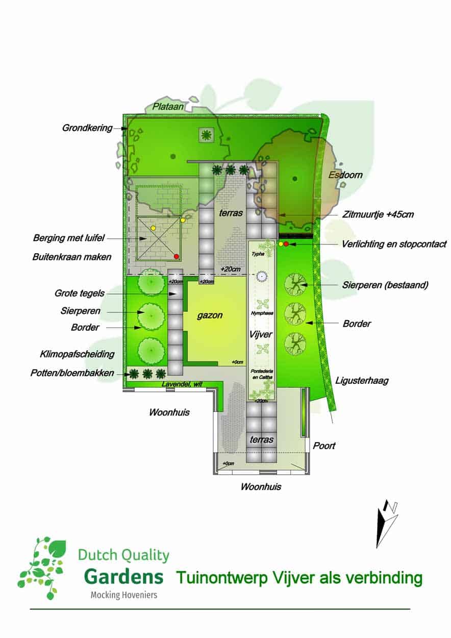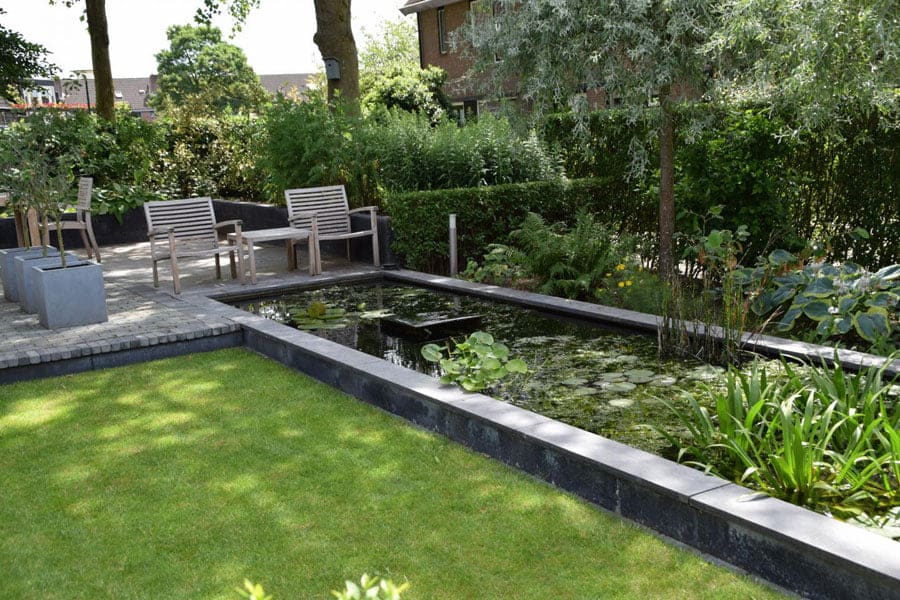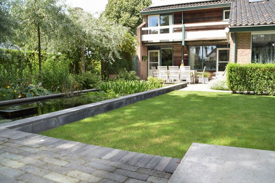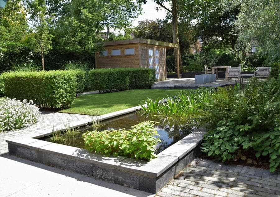 Een vijver is altijd een blikvanger in de tuin, zeker hier! Het is de zichtlijn en verbinding tussen de voor- en achterzijde van de tuin. Rechte belijning, grote tegels, een modern tuinhuis in combinatie met Ligusterhagen en gazon maken dit tot een prettige tuin om naar te kijken en in te verblijven. Overigens: in iedere tuin is plaats voor een mooi kunstwerk!