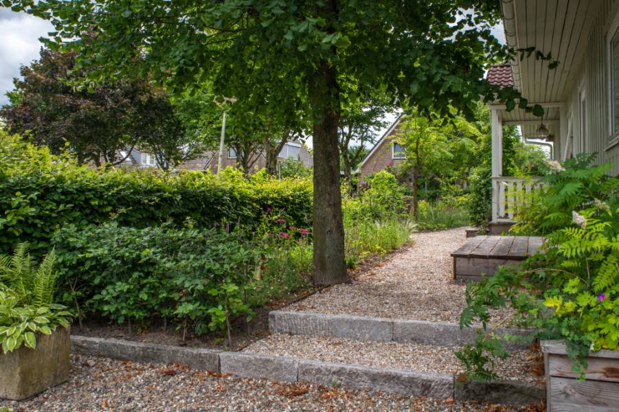 Er zijn aanpassingen binnen de tuin gemaakt om o.a. meer structuur binnen de tuin te krijgen. Zo zijn er (schelpen)paden aangelegd en is het hoogteverschil in de tuin benadrukt met een trap van (hergebruikte) natuurstenen beams.