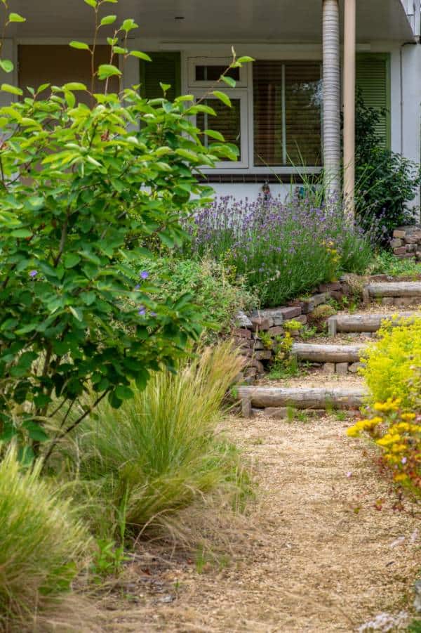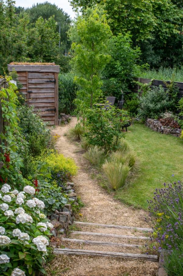 In de stapelmuurtjes binnen deze tuin zijn verschillende restanten tegels gebruikt. Dit geeft een speels effect. De paden en het terras achter in de tuin zijn gemaakt van halfverharding.