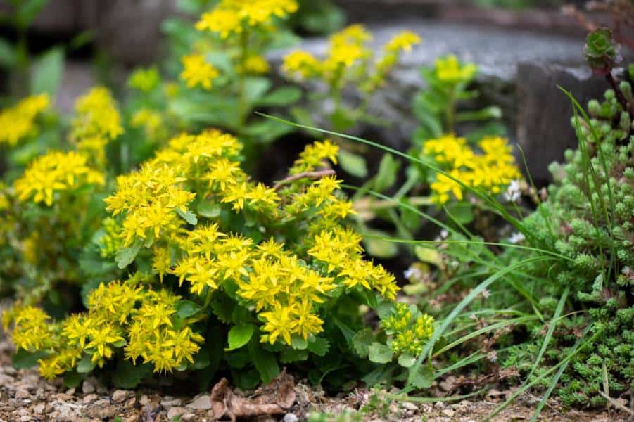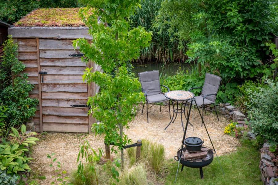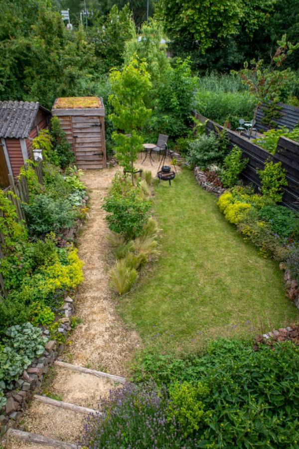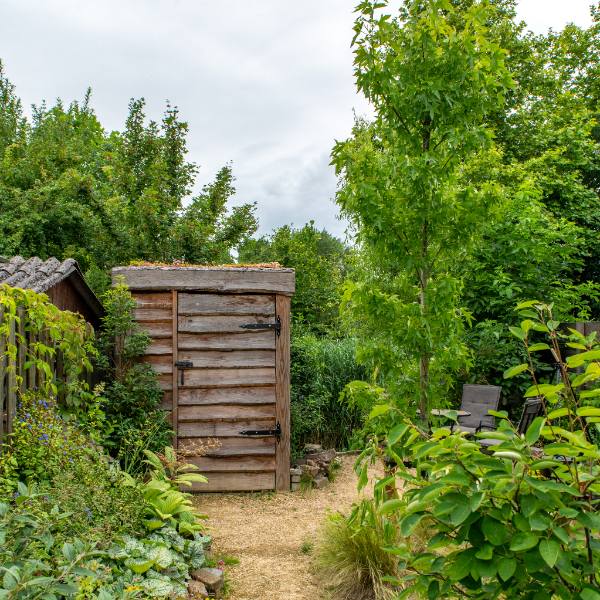 De schuur achter in de tuin is gemaakt van potdeksels die reeds aanwezig waren in de tuin. Op het dak van de schuur is sedum geplaatst.