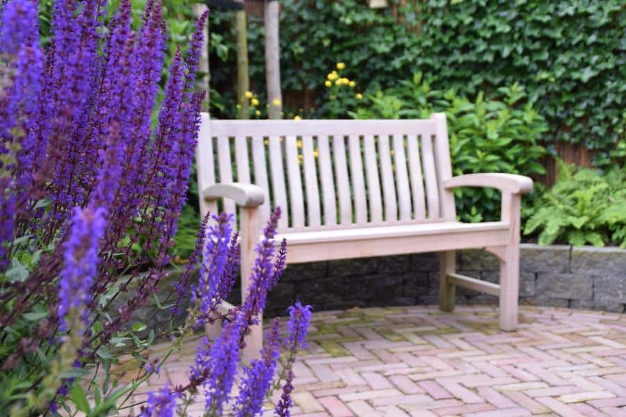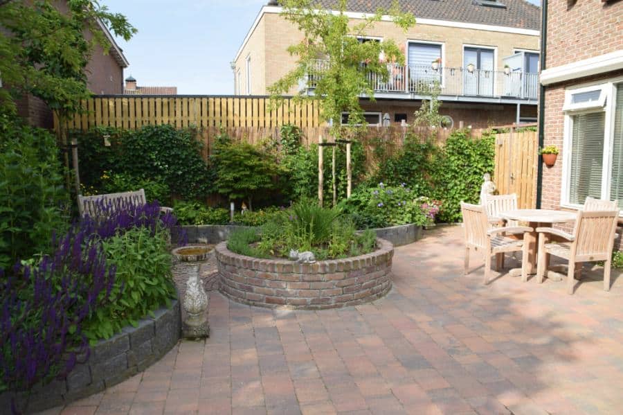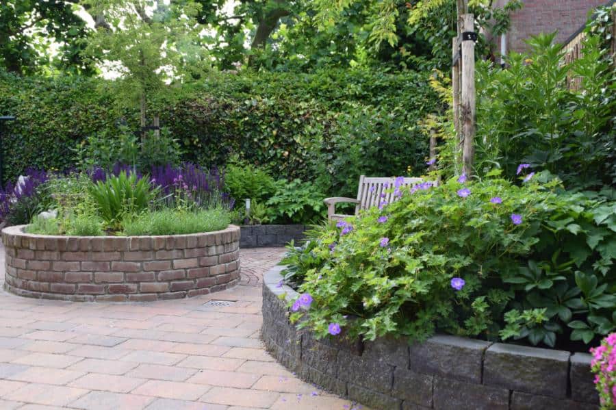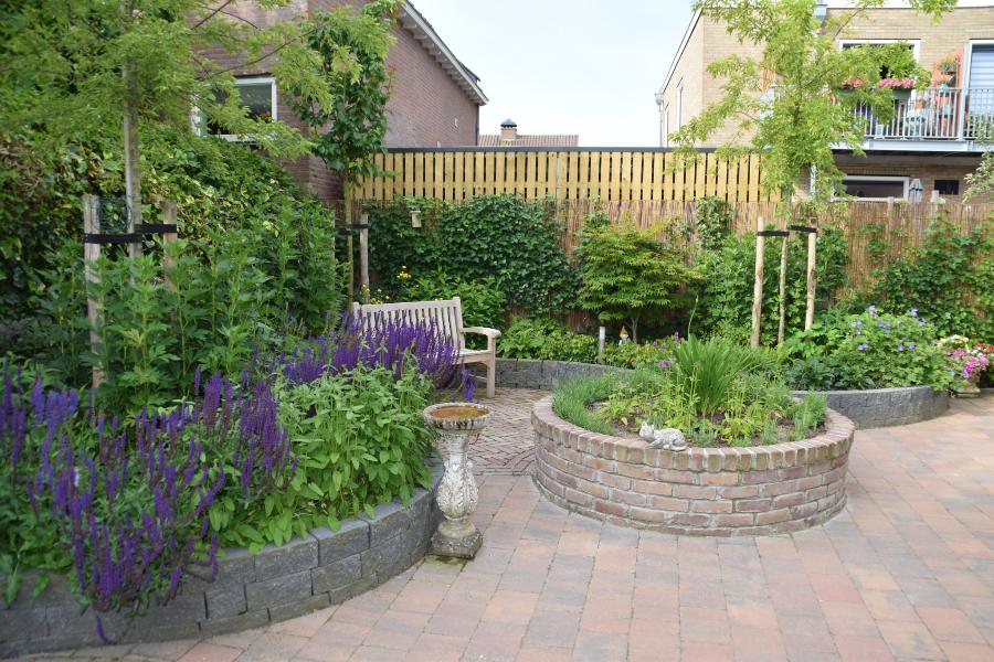 Door te werken met ronde vormen zijn aparte zitplaatsen gecreëerd in deze tuin. Ook de plantvakken zijn in rondingen vormgegeven.