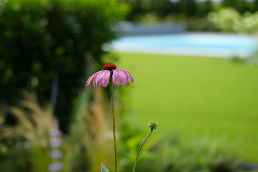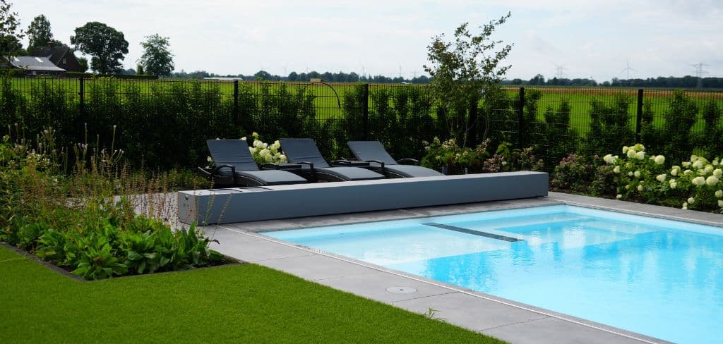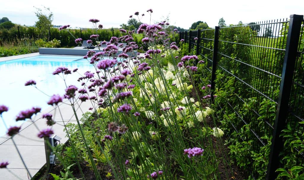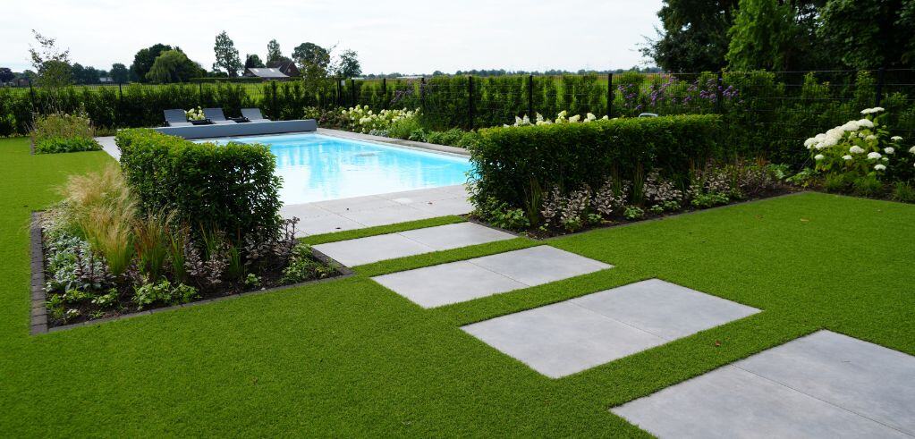 Moderne achtertuin met zwembad, groenblijvende hagen en kleurrijke borders