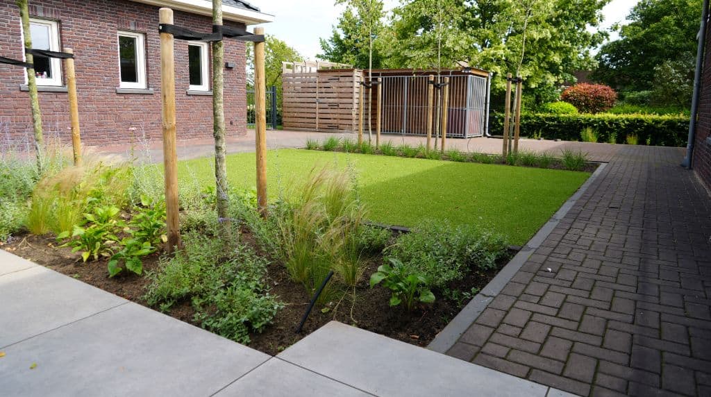 De bewoners wensten een tuin om volop van te genieten, maar met zo min mogelijk onderhoud. We realiseerden een strak tuinontwerp dat perfect past bij de nieuwbouwwoning.