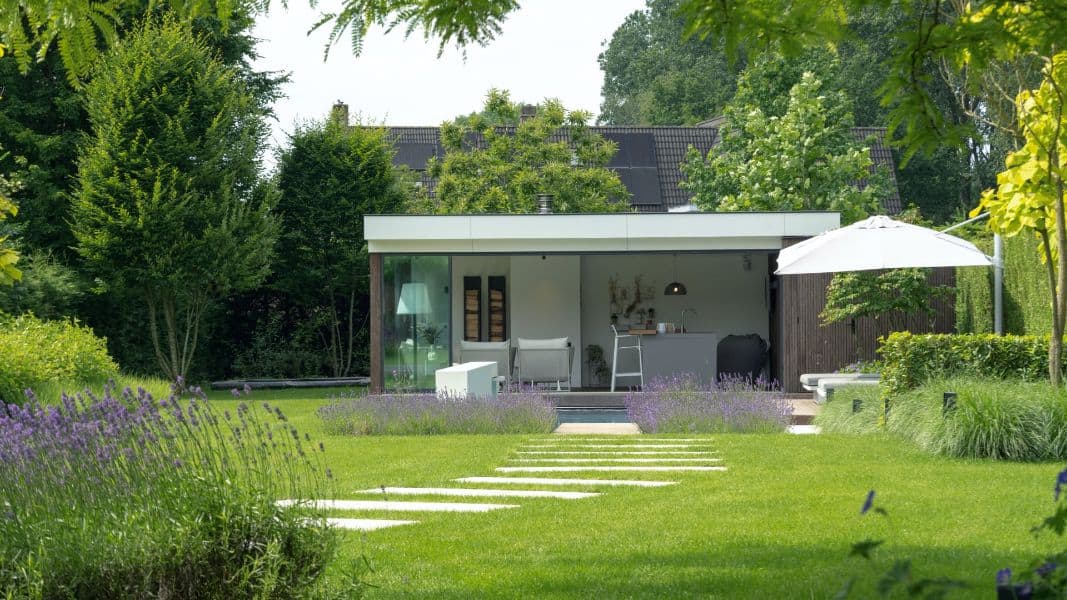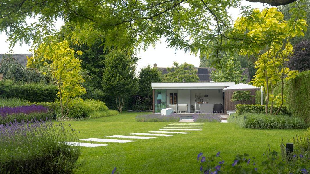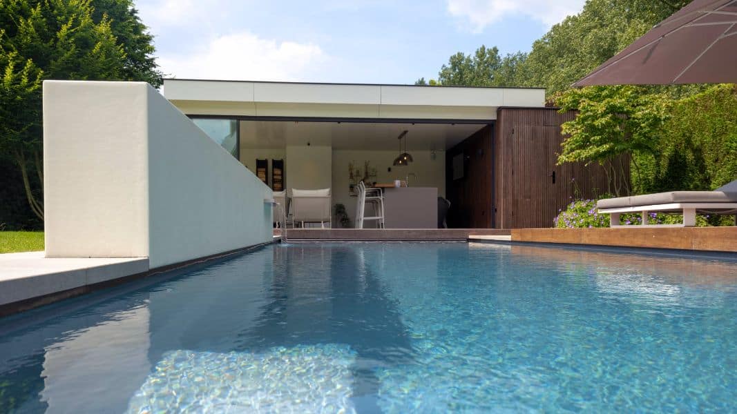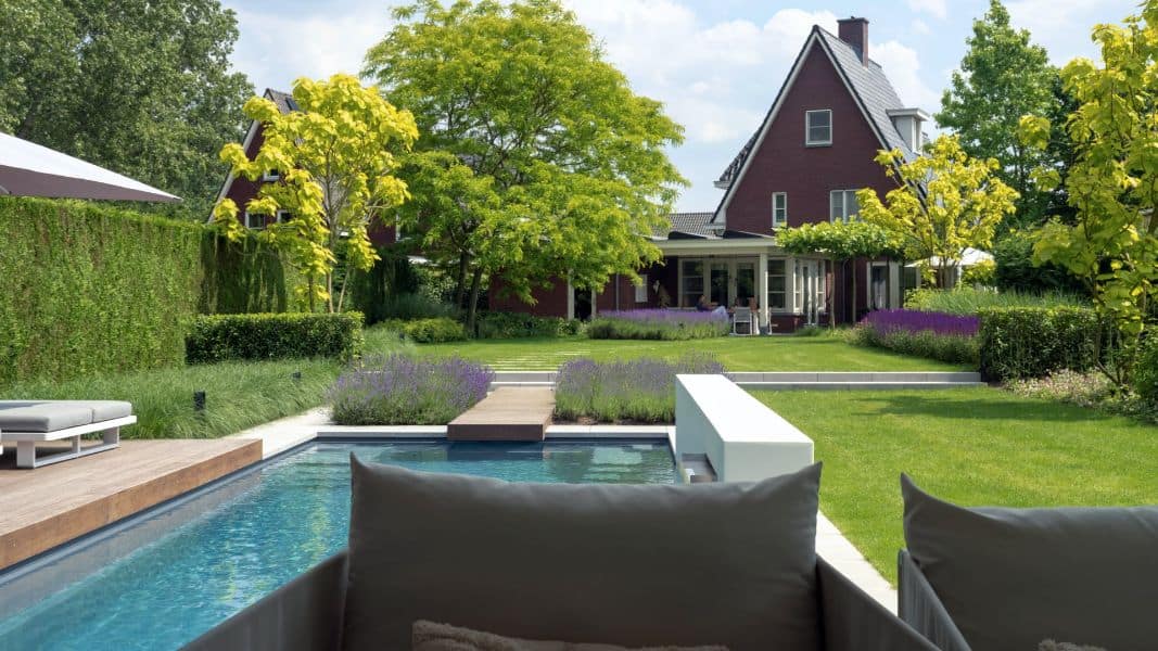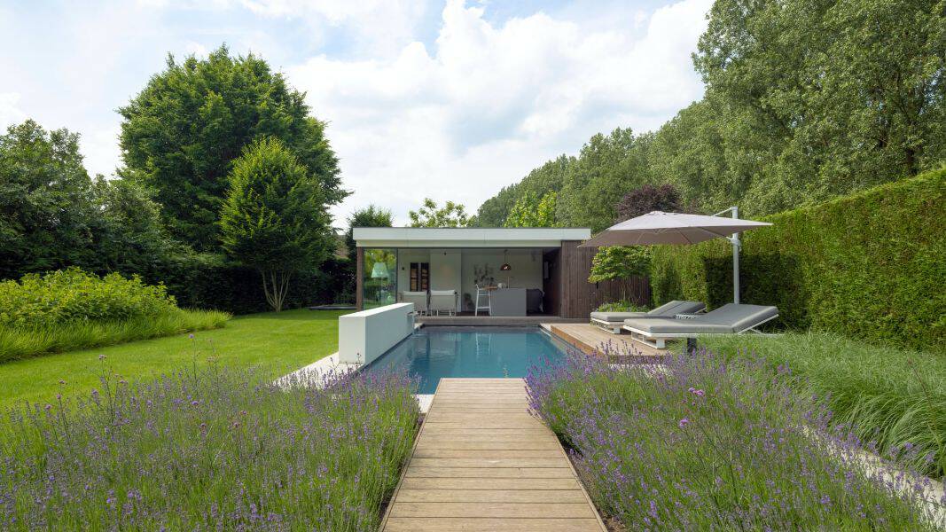 Deze luxe tuin verbindt woning, zwembad en poolhouse tot een geheel.