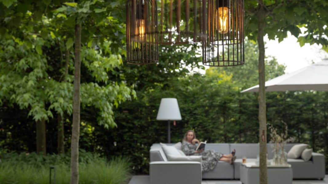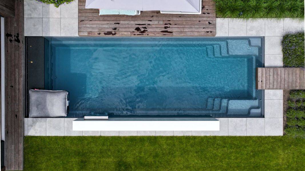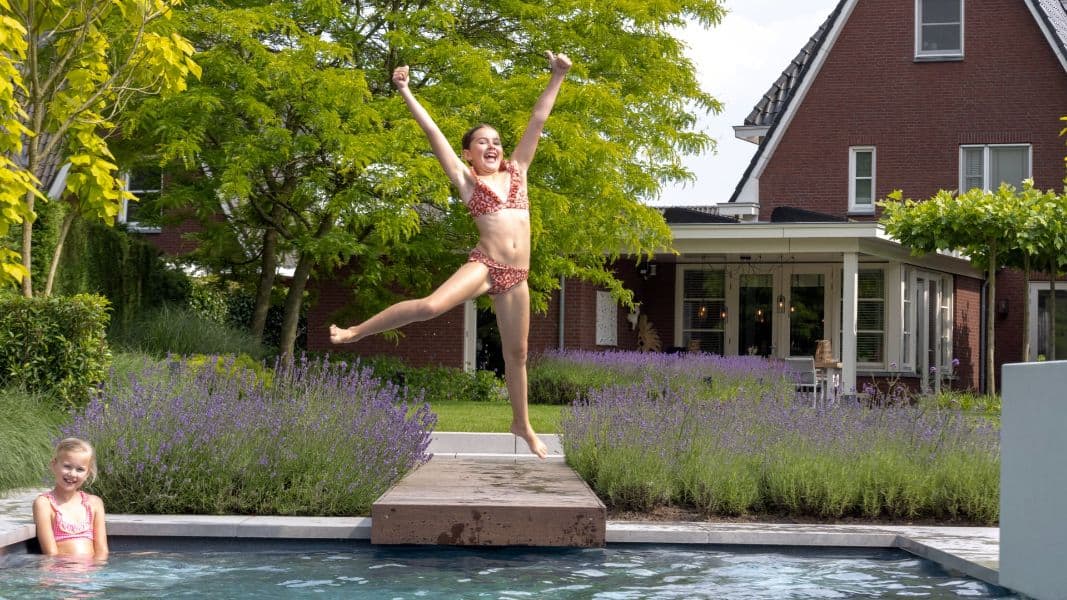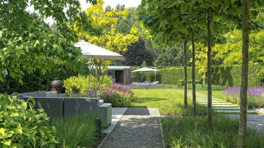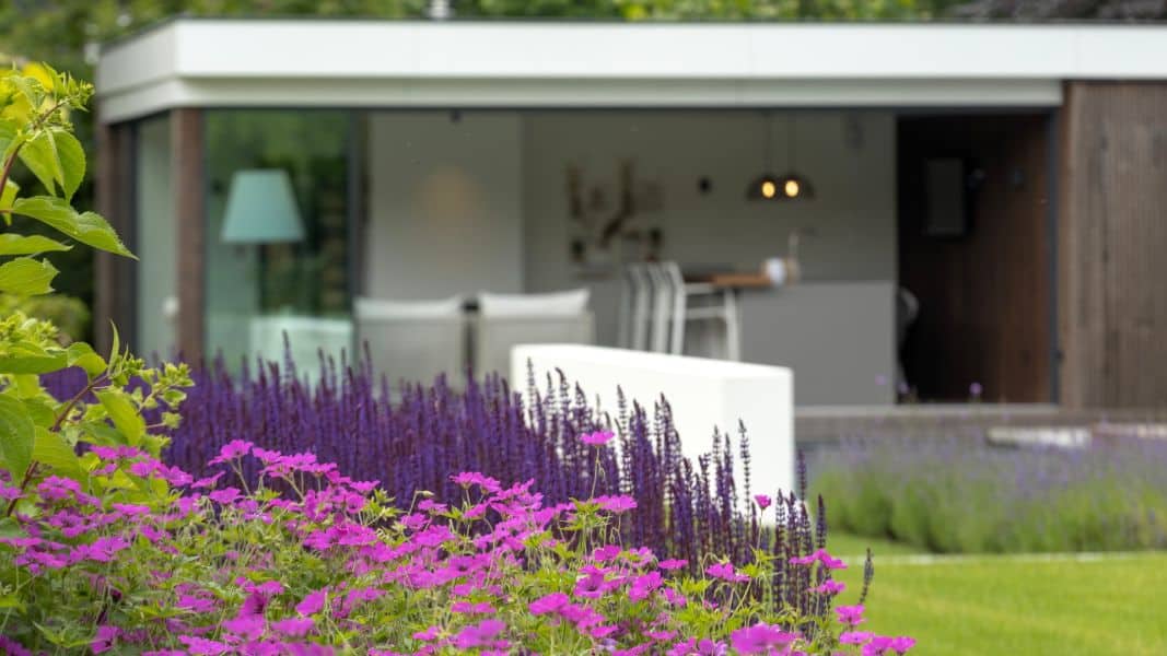 Deze luxe tuin verbindt woning, zwembad en poolhouse tot een geheel.