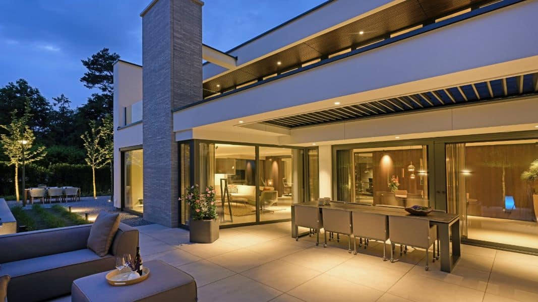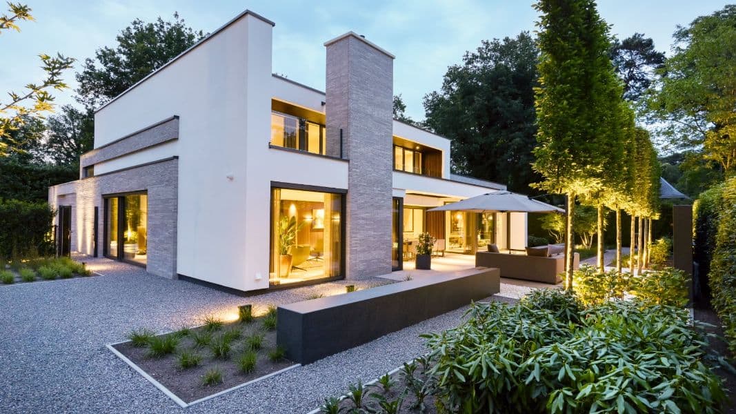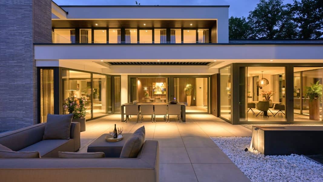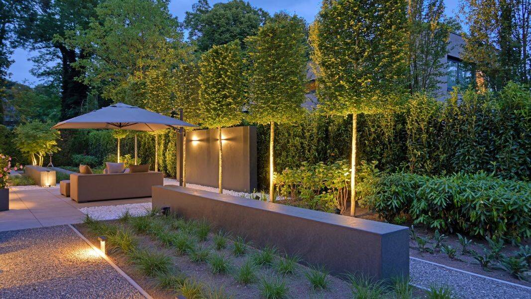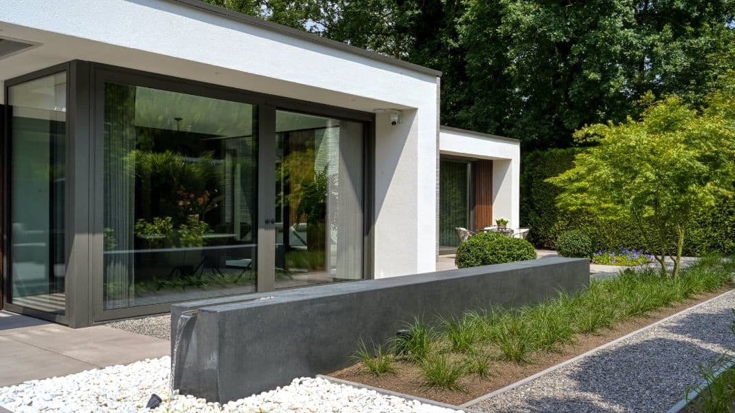 Waterpartijen zorgen voor sfeer en privacy, terwijl rijke beplanting het hele jaar door kleur en structuur biedt. Verlichting maakt de tuin ook ’s avonds betoverend.