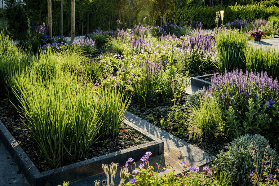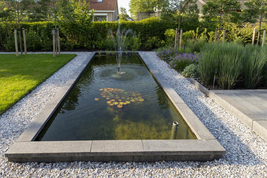 Moderne tuin met kleurige beplanting, vijver en strakke borders