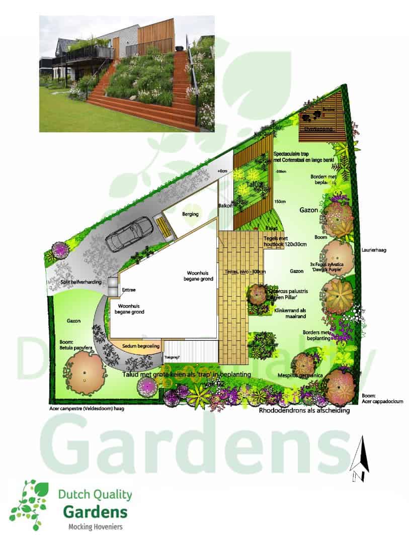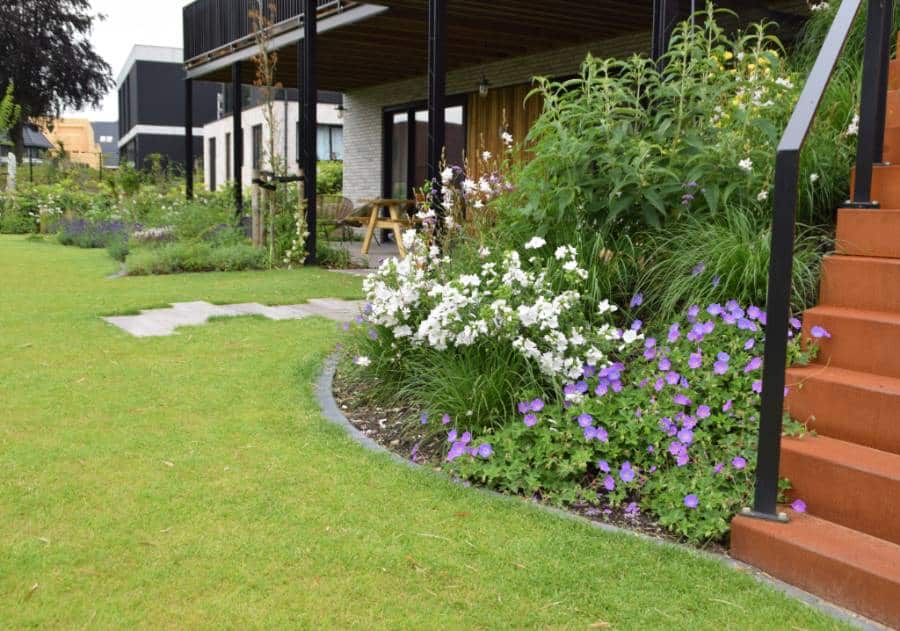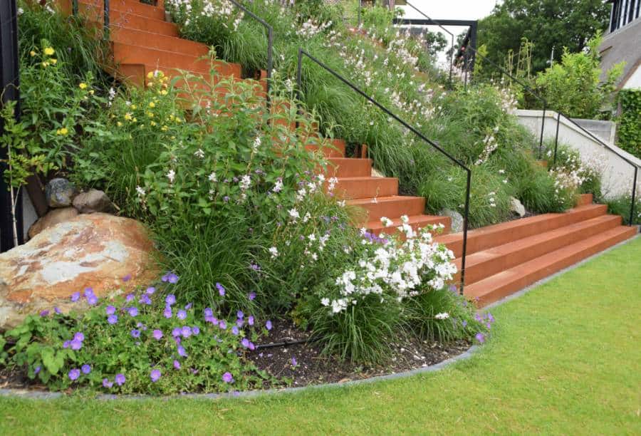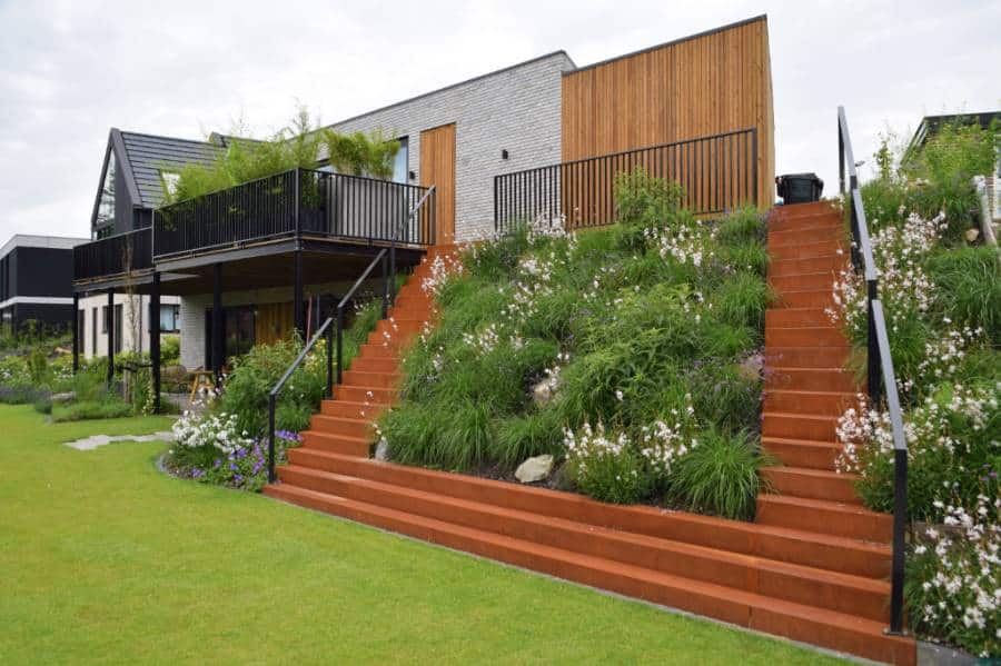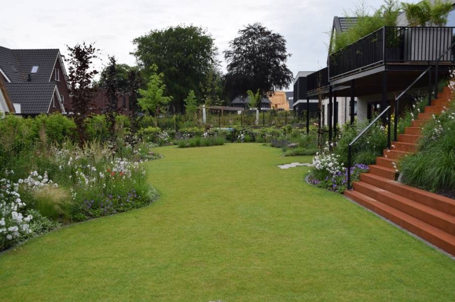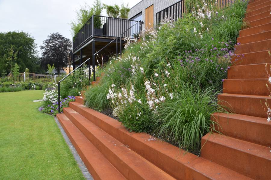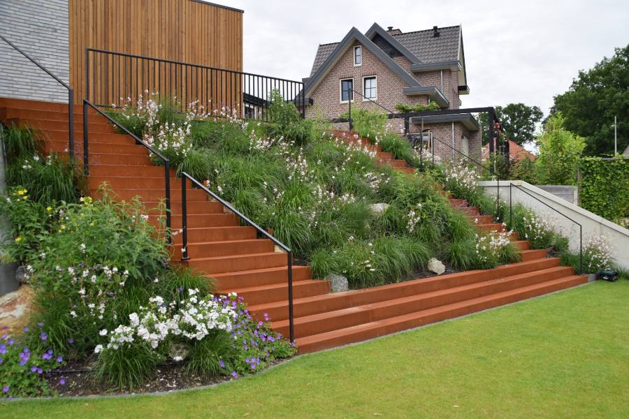 Beide taluds vallen op in de tuin. Het ene talud is voorzien van een prachtige trappartij van Cortenstaal, het andere talud heeft een natuurlijk karakter en is te betreden via grote zwerfkeien.
