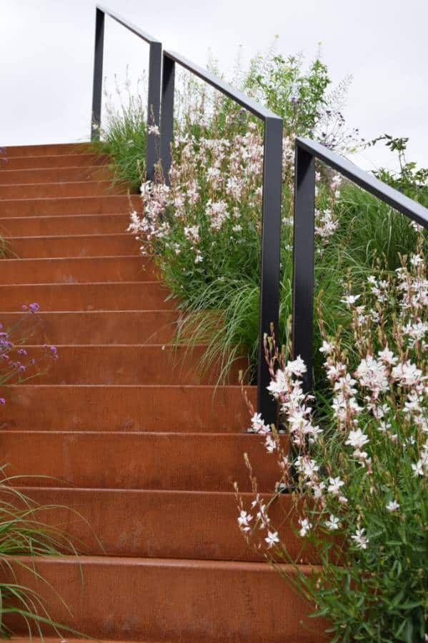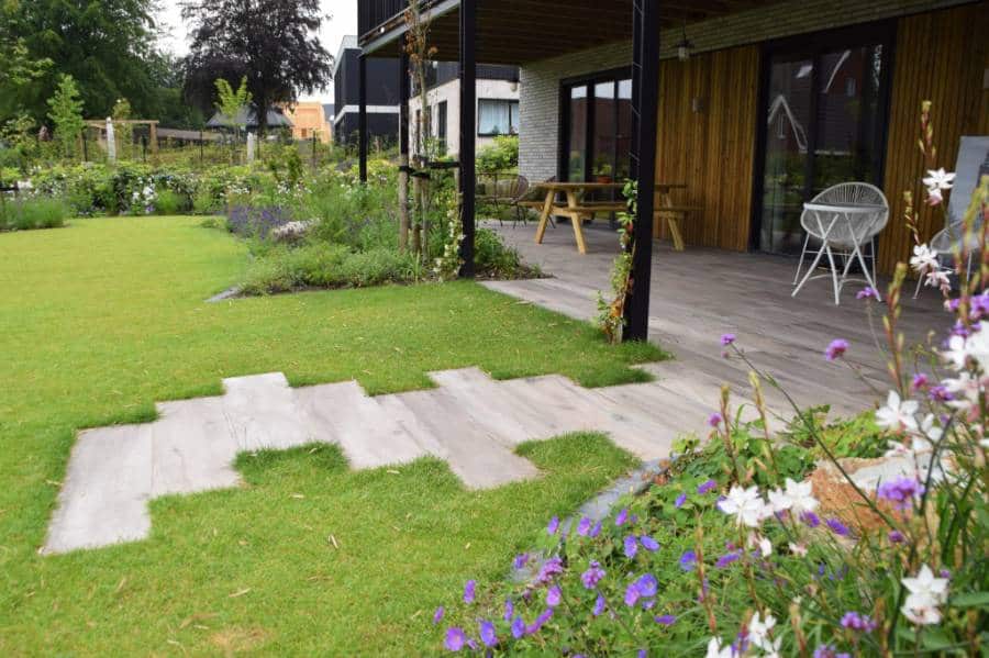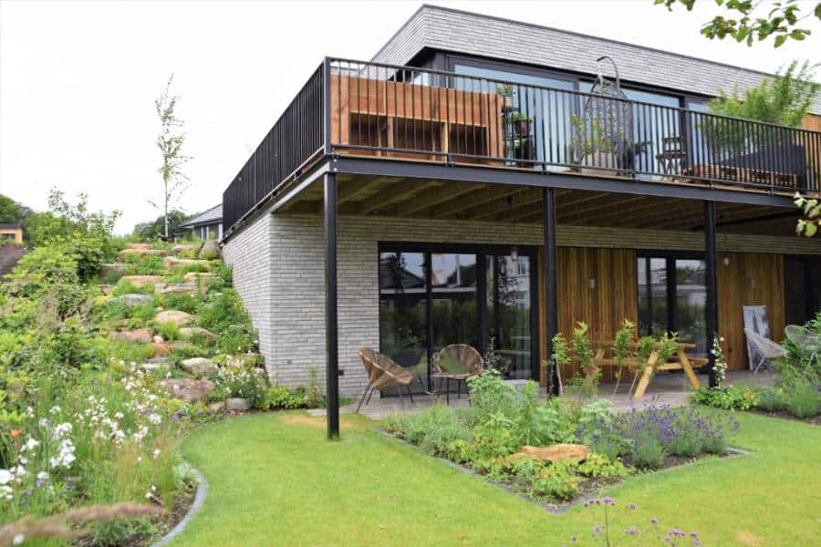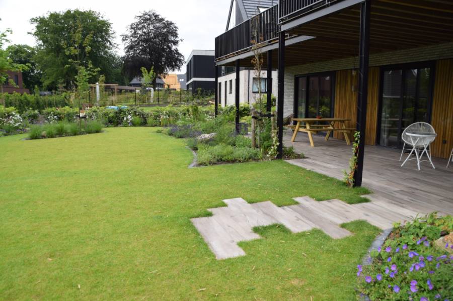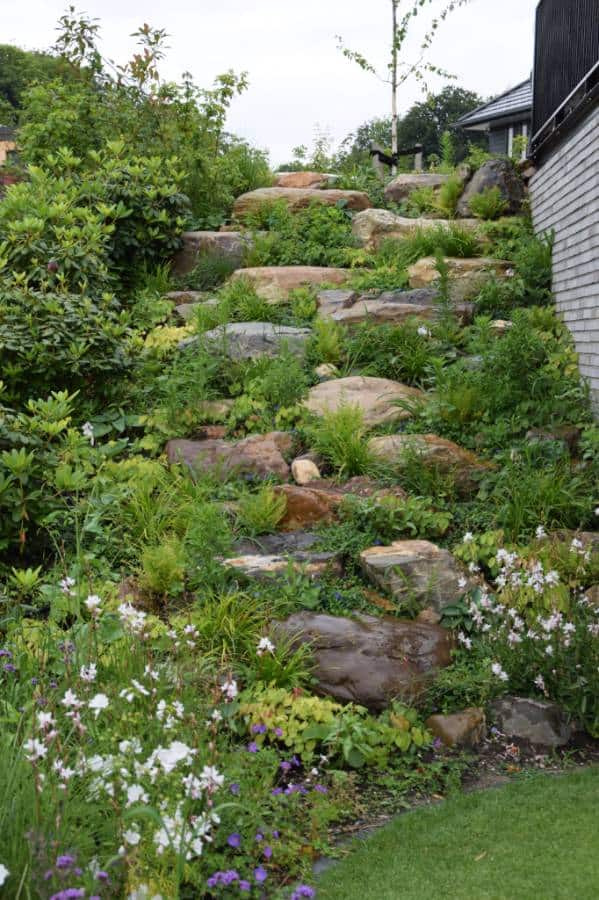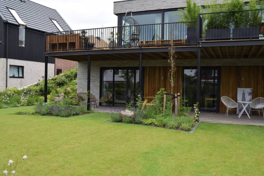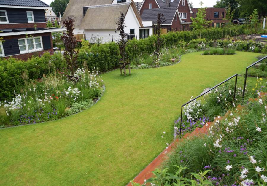Beide taluds vallen op in de tuin. Het ene talud is voorzien van een prachtige trappartij van Cortenstaal, het andere talud heeft een natuurlijk karakter en is te betreden via grote zwerfkeien.