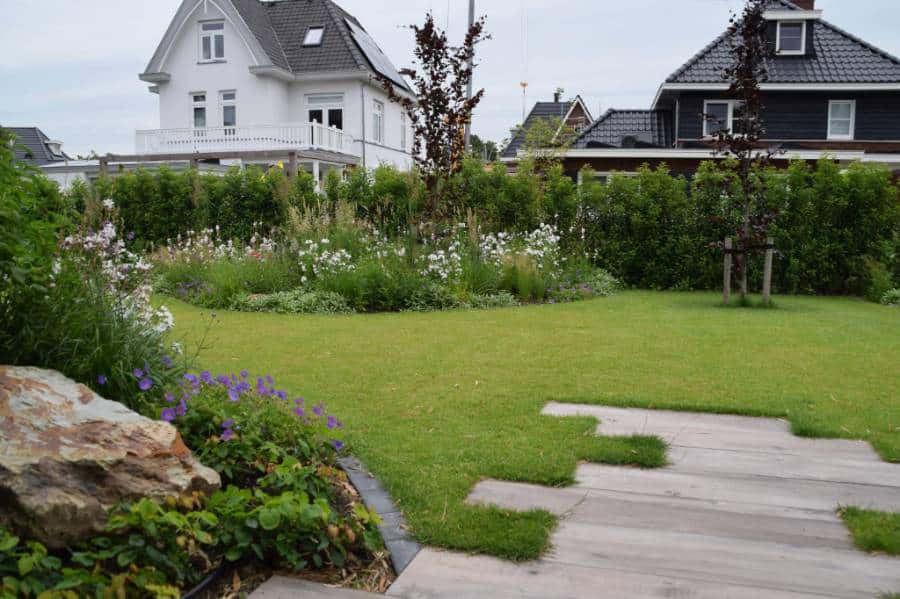 Deze tuin met een aantal beeldbepalende bomen en grote diversiteit in beplanting oogt vriendelijk en natuurlijk. De organische vormen van het gazon en de beplanting zijn de verbindende factor binnen de tuin. De gekozen beplanting zorgt voor eenheid en rust in het totaalbeeld.