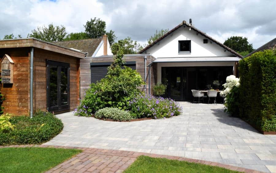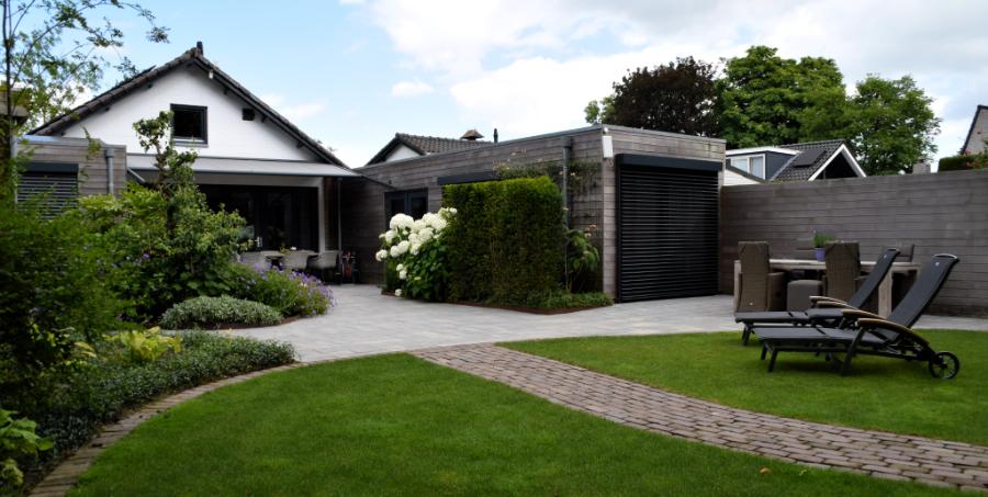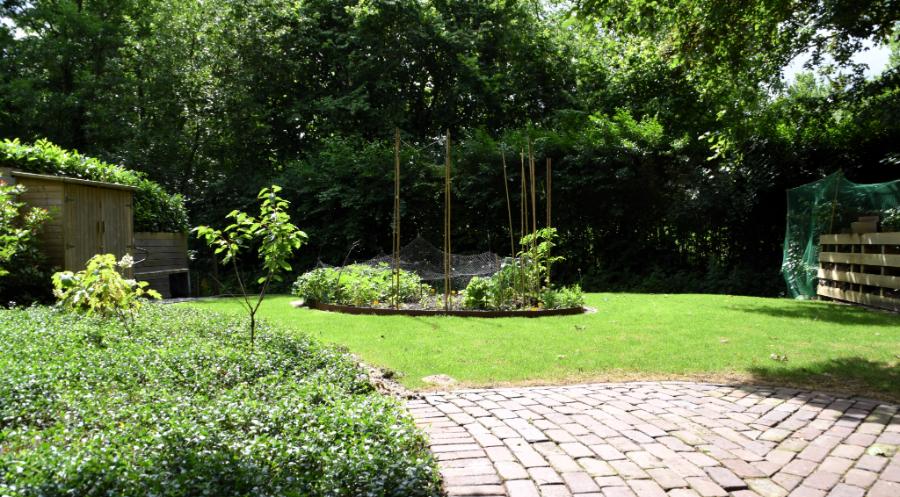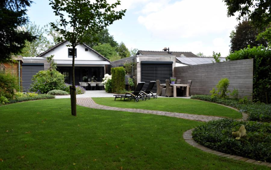 Een parkachtige achtertuin met modern gedeelte rondom het woonhuis. Door deze combinatie is de tuin een mooie verbinding tussen het landelijk gebied en de woning.