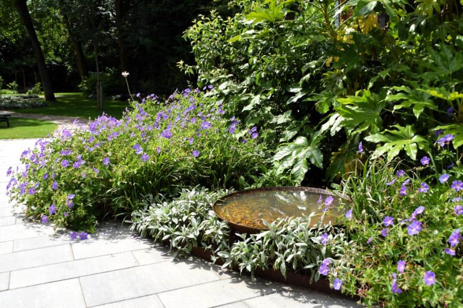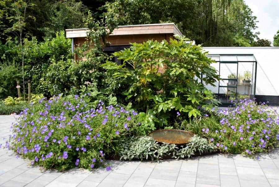 Het gebruik van Cortenstaal in de kantopsluitingen, de waterschaal en de pergola zijn een modern onderdeel van de tuin. De invulling met bodembedekkende beplanting en opvallende heesters en bomen zorgen ervoor dat er een rustig en samenhangend geheel ontstaat.