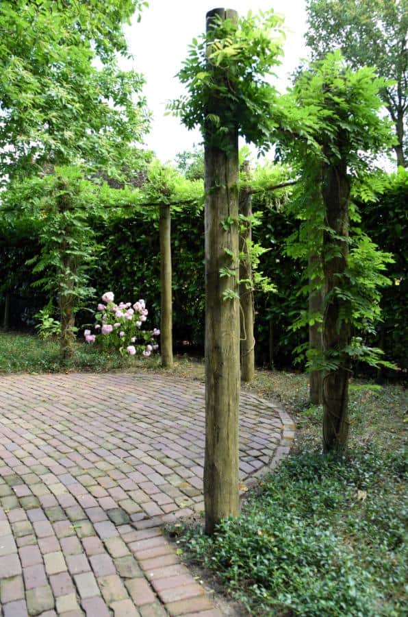 Parkachtige achtertuin met cortenstaal en pergola