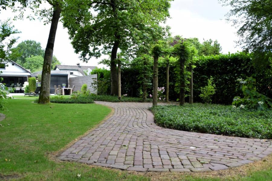 De ronde belijningen zorgen voor een vriendelijk beeld en maken diverse glooiingen en looplijnen in de tuin mogelijk. De bestrating met tegels in banenverband geven een modern en eenduidig geheel aan het grote terras.