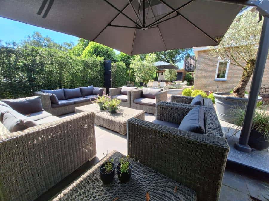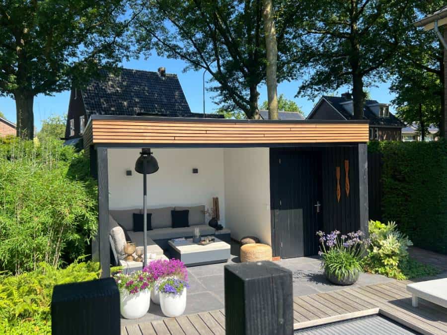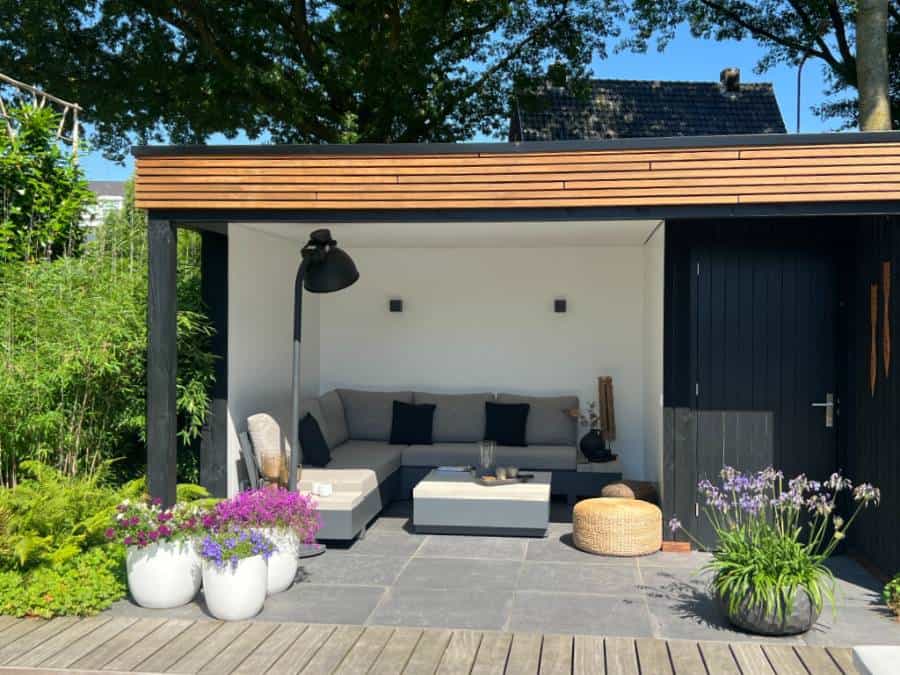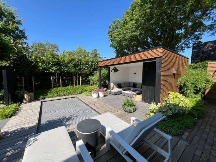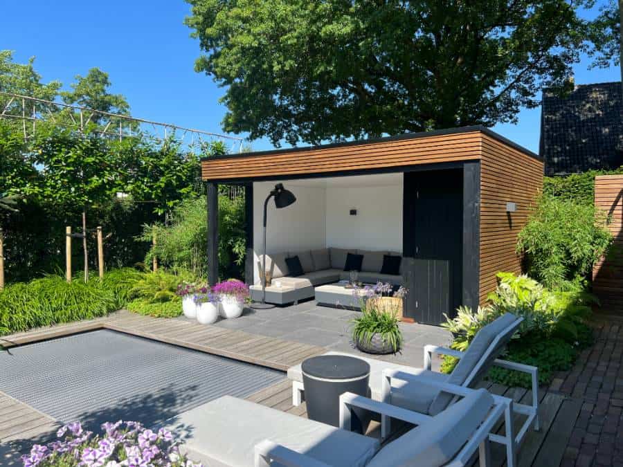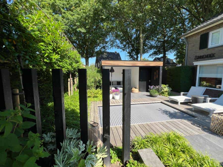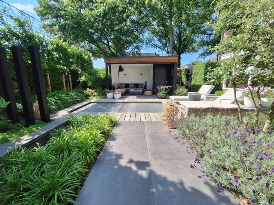 Een echte relaxtuin met strakke vormen om helemaal tot rust te komen. De tuin is voorzien van een plunge pool met jetstream en buitendouche. Na het zwemmen is het heerlijk vertoeven op de twee terrassen, in de sfeervol ingerichte buitenkamer of op de ligbedden bij het zwembad.