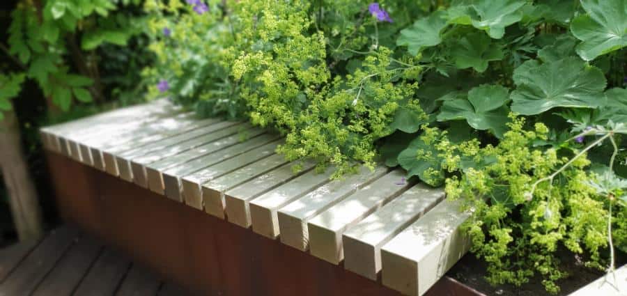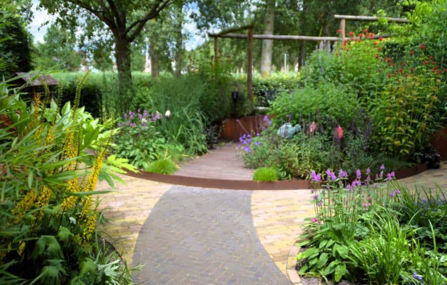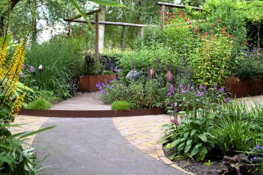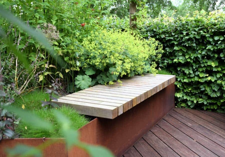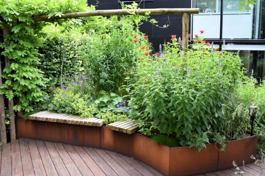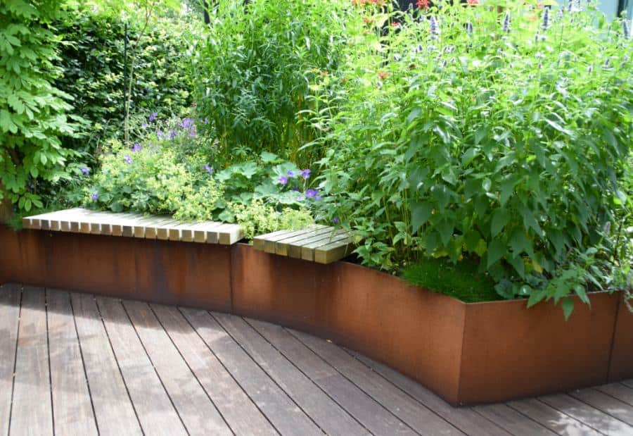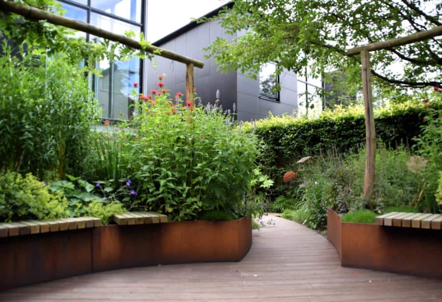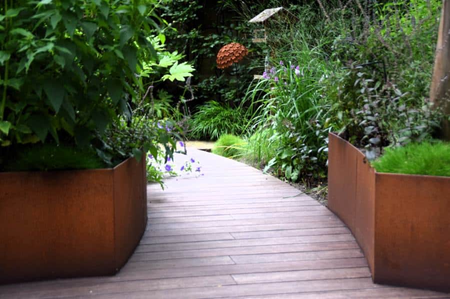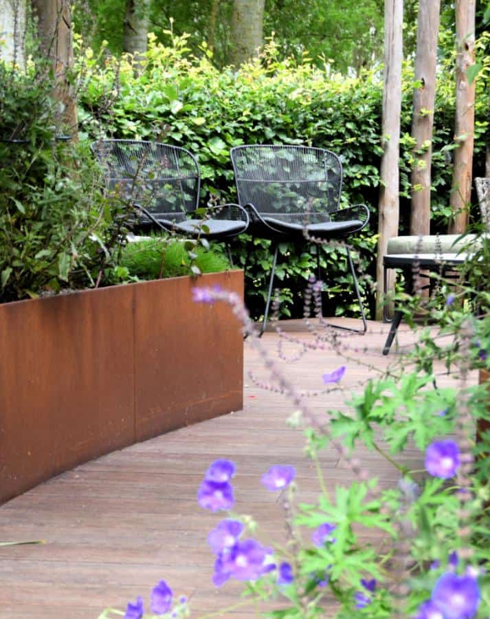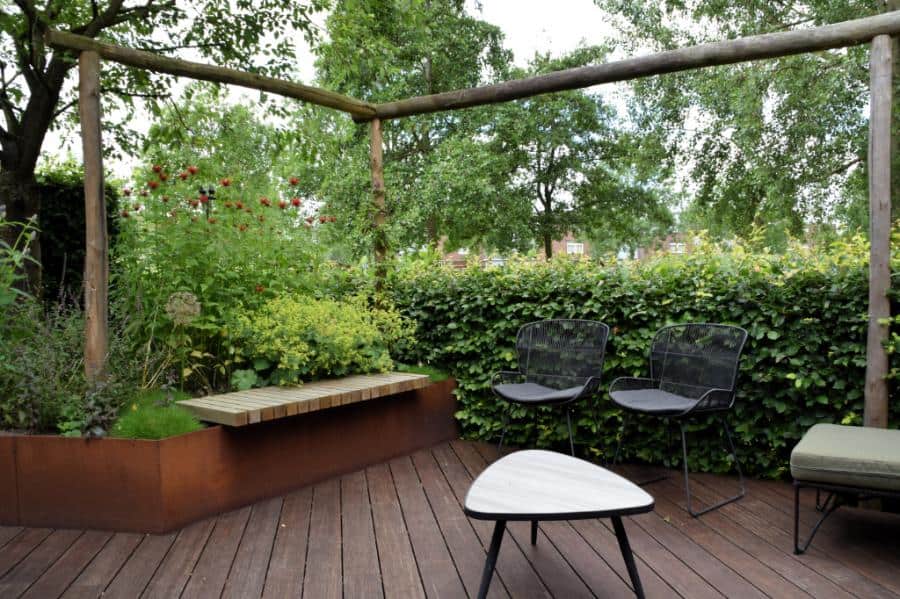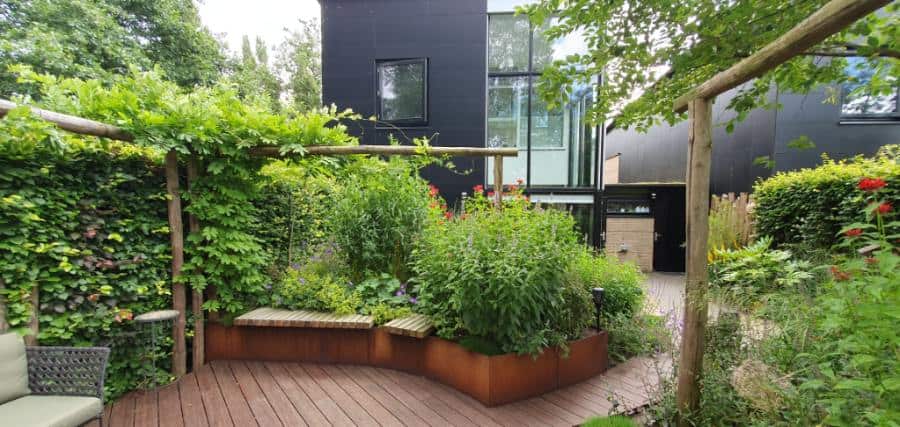 Het Cortenstaal en de verhoogde vlonder, met ronde vormen, van Bamboe hout maken deze tuin modern en uniek in zijn soort. Het toepassen van de verhogingen met Straight Curve Flexline Cortenstaal oogt zeer fraai.