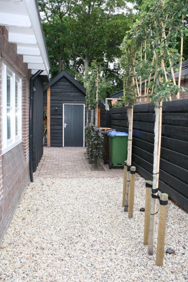 De afvalcontainers staan uit het zicht achter beukenhagen en aan een grindpad dat start aan de voorzijde van de woning en overgaat in het terras van de achtertuin.