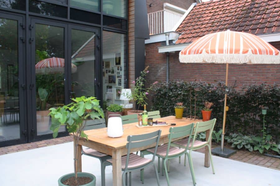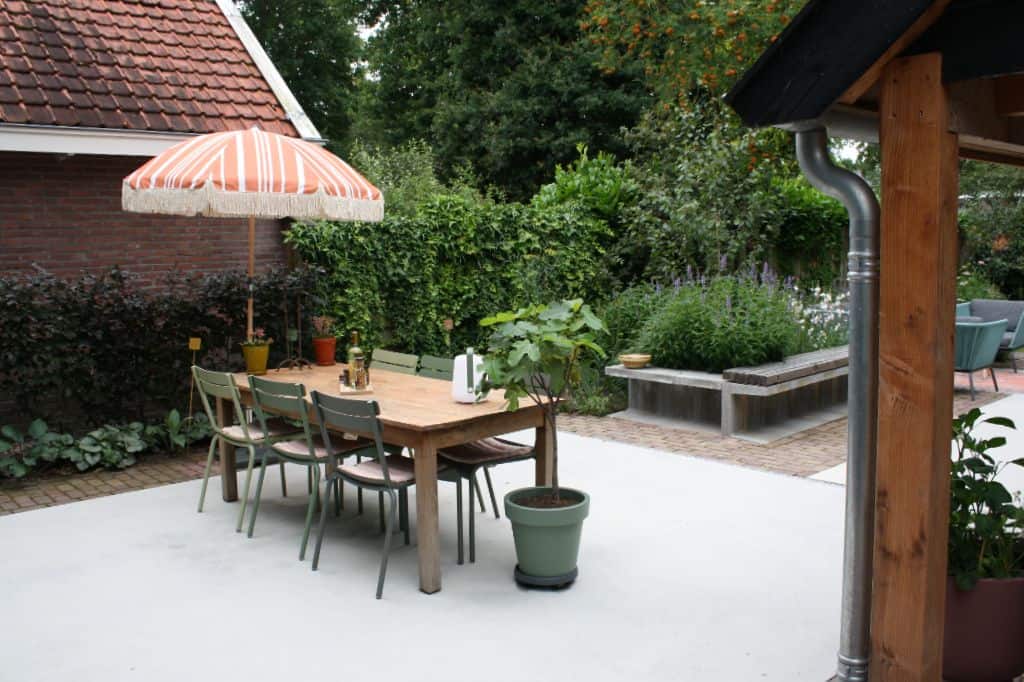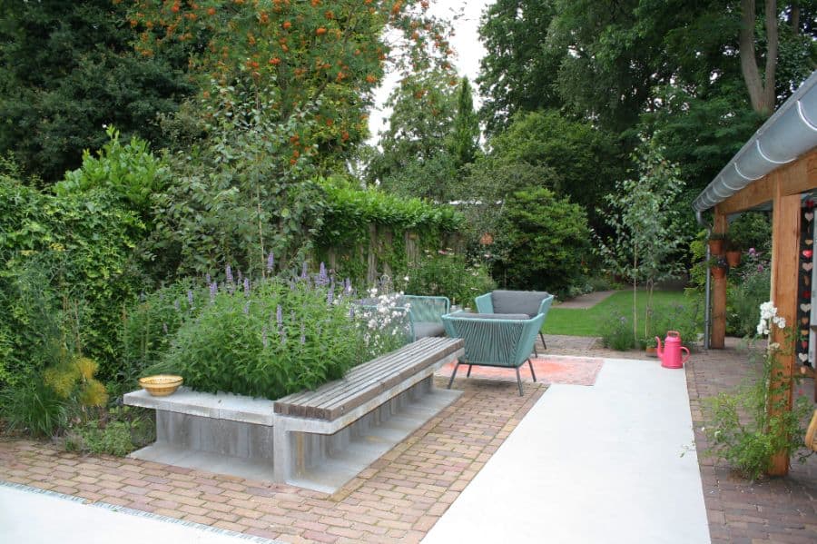 Achter het reeds bestaande tuinhuis is een buitendouche gecreëerd. Naast het tuinhuis is een ruim terras gerealiseerd. Het terras is een combinatie van gevlinderd beton en authentieke stenen. Een passend geheel met de moderne achtergevel van de woning.