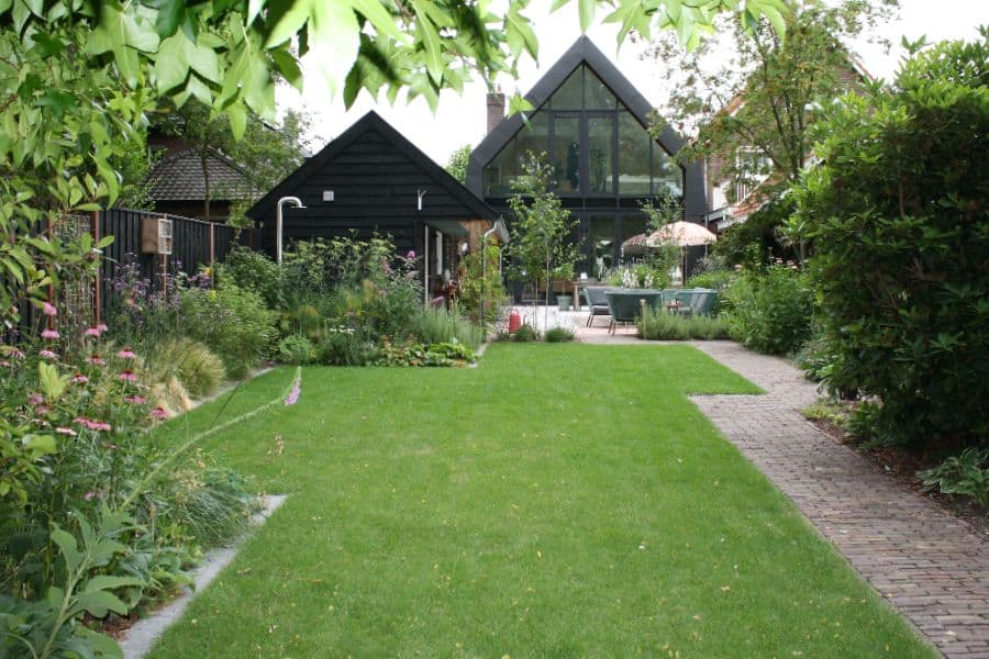 Strakke, diepe tuin met speelse beplanting