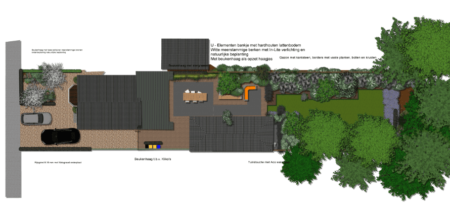 Deze achtertuin is erg langgerekt en diep. Met deze reden is er gekozen om speelse verspringen in het ontwerp toe te passen. Iets waar de tuineigenaar zich helemaal in kon vinden.