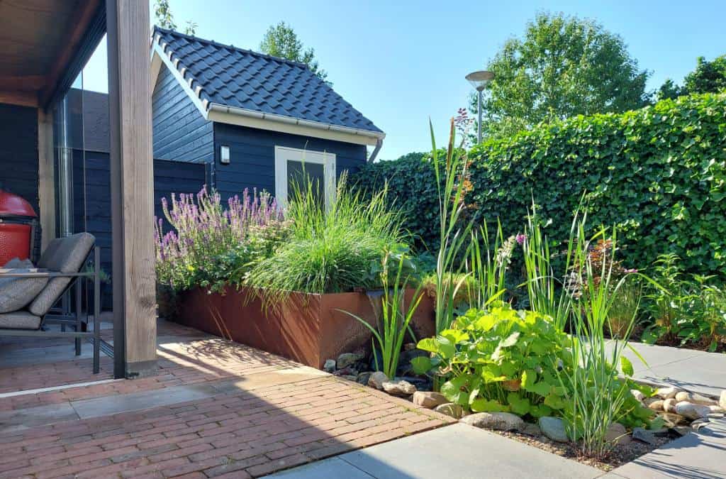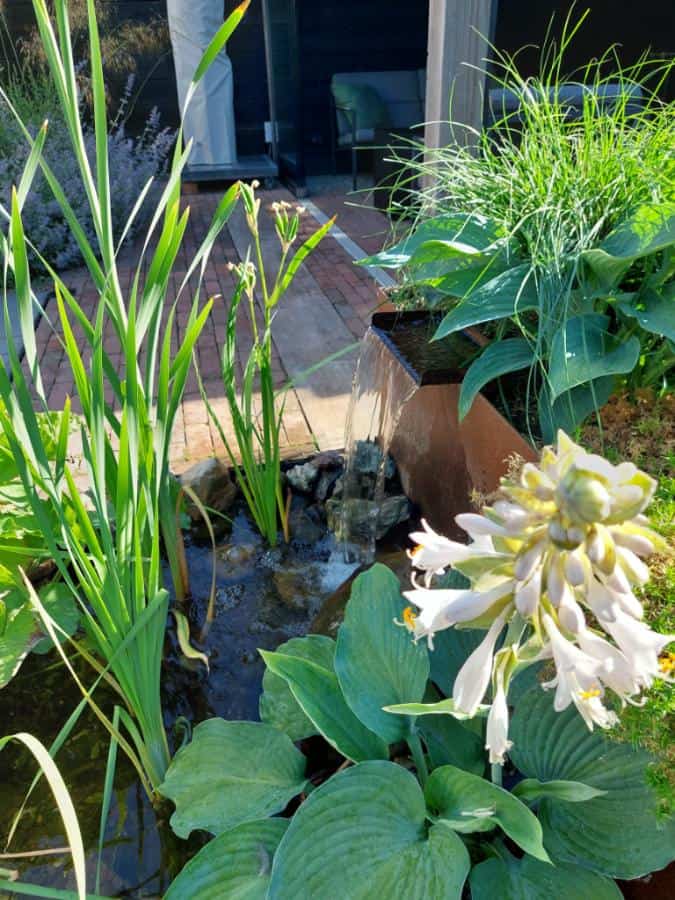 Vanuit de centrale, cortenstalen plantenbak met een diversiteit aan beplanting, stroomt een kleine waterval, heerlijk rustgevend. De waterval mondt uit in een kleine vijver met waterplanten.