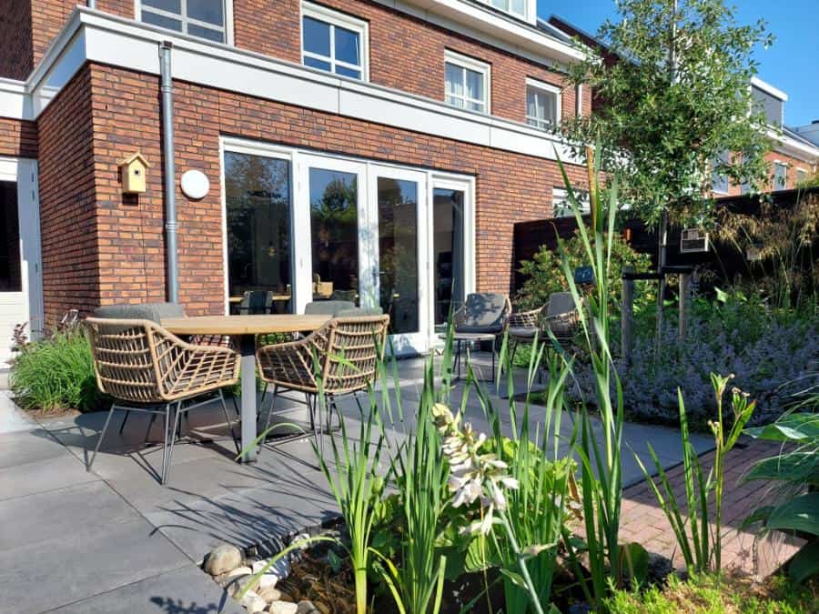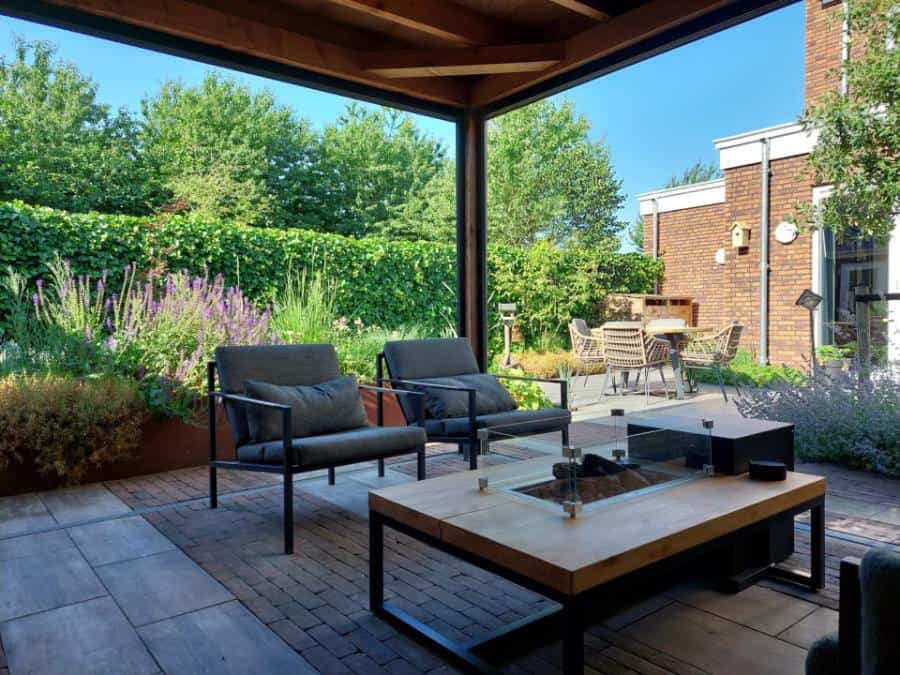 De aangelegde terrassen zijn gemaakt van keramische tegels i.c.m. klinkers en de schutting (met poort) is gemaakt van zwart Zweeds rabat.