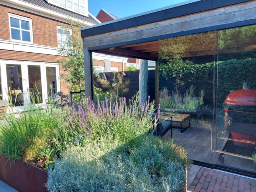Door de overkapping met glazen schuifwanden en de geplaatste in-lite tuinverlichting, kunnen deze tuineigenaren (bijna) het hele jaar genieten van hun tuin en lekker buiten grillen op hun favoriete, niet zo groene, egg.