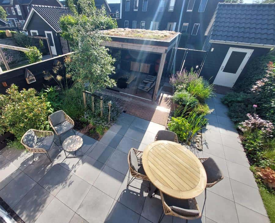 Voor de overkapping is er gekozen voor een sedum dak. Lekker duurzaam en hiermee krijg je vanuit de hoger gelegen slaapkamers ook een mooi groen uitzicht.