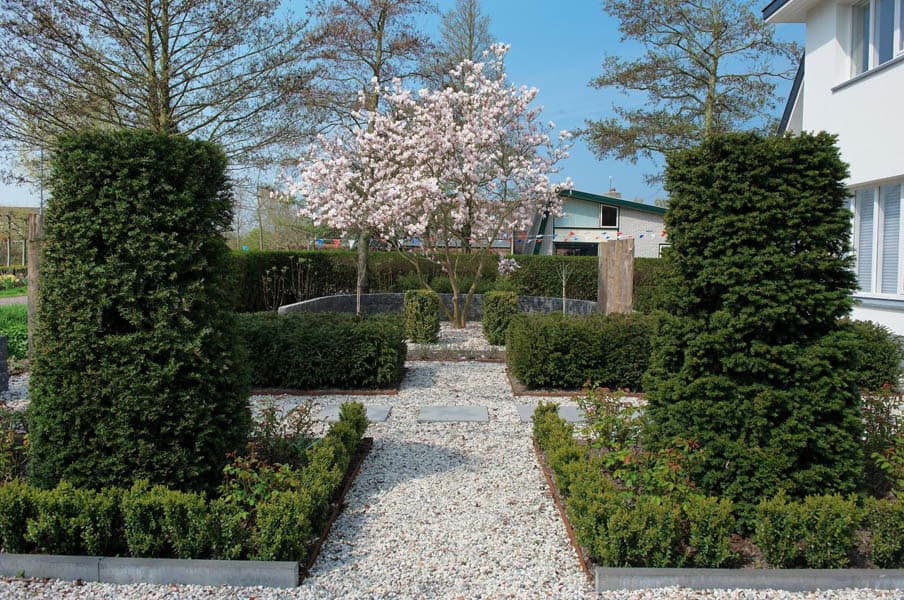 Zeeuwse tuin met taxuszuilen en cortenstaal kantopsluiting